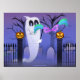 Ein Geist mit Maske tanzt am Eingang eines Friedhofs, flankiert von zwei Jack O'Lanterns.