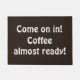 Dieses ist eine Spaßkaffeefarbe und eine Kaffee-Sprichwortfußmatte für Kaffeeliebhaber, die "herein angegangen sagt! Kaffee fast bereit!"
