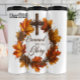 Diese Grafik zeigt eine Dornenkrone, die in einen rustikalen Kranz mit orangefarbenen und roten Ahornfarben verwickelt ist. Ein Holzkreuz steht in der Mitte des Kranzes. Der Text "Krönt mit Seiner Herrlichkeit" ist in einem eleganten, fließenden Schriftsatz geschrieben, der eine mächtige religiöse Botschaft vermittelt.