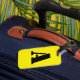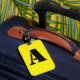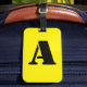 Das Design weist einen hellen, gelben Hintergrund auf Ihrem Monogramm auf, der in einer fett gedruckten, schwarzgestanzten Schrift angezeigt wird. Erleichtert das Auffinden Ihres Gepäcks! Erhältlich in verschiedenen Farben.