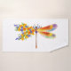 Künstlerisch bemalt, florale Libelle in kontrastierender Orange und lila mit gelben, hellen, blühenden kalifornischen Mohn und blauen Wildblumen auf weißem Hintergrund.