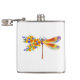 Künstlerisch bemalt, florale Libelle in kontrastierender Orange und lila mit gelben, hellen, blühenden kalifornischen Mohn und blauen Wildblumen auf weißem Hintergrund.