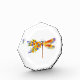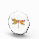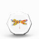 Künstlerisch bemalt, florale Libelle in kontrastierender Orange und lila mit gelben, hellen, blühenden kalifornischen Mohn und blauen Wildblumen auf weißem Hintergrund.