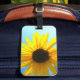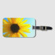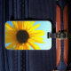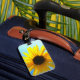 Dieser Gepäckanhänger hat eine gelbe Blume darauf.