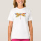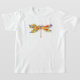 Künstlerisch bemalt, florale Libelle in kontrastierender Orange und lila mit gelben, hellen, blühenden kalifornischen Mohn und blauen Wildblumen auf weißem Hintergrund.