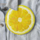 Geringe polnische moderne geometrische Gestaltung, frisch gelbe Zitronenscheibe rund Kissen. Das sonnige Fruchtmuster im polygonalen Design.