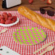 Abstrakte digitale Kunst von Kalkgrün und rosa Quadraten in einer karierten Formation.