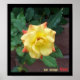 Gelbe und orangefarbene Rose, umgeben von natürlichem Grün und einer Ziegelwand.
