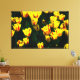 Auf einem Blumenbeet zaubern Blume in Gelb und Rot. Sonnenlicht und dunkelgrüner Hintergrund. Tulpen sehen aus wie brennende Kerzen. Gelbe Tulpe steht für Hoffnung, Fröhlichkeit und helles und rätselhaftes Lächeln.