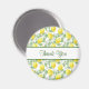 Ein Dankeschön-Magnet mit Dankeschön geschrieben in einem weißen Banner mit einer grünen Grenze. Der Hintergrund ist mit gelben Zitronen und grünen Blätter in einem sich wiederholenden Muster gestaltet.