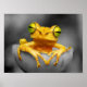 Schwarz-Weiß-Foto mit einem niedlichen, gelben Frosch mit großen grünen Augen und Spindeln Fingern, sitzen in der Hälfte einer ausgehöhlten Tomate.