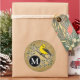 Ein niedlicher, fröhlicher, hellgelber Vogel thront auf einem Zweig, der mit stilisierten Wirbel und Blätter auf hellbraunem Hintergrund in dieser naturalistischen Abbildung geschmückt ist. Personalisieren Sie den schwarzen Kreis neben dem Warbler mit einem weißen Monogramm. Ein einzigartiges Geschenk für Vogelbeobachter, Naturliebhaber, Wanderer und Outdoorsmen!