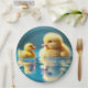 Gelbes Entenlein mit einer Spielzeug-Gummihaube Pappteller