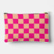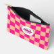 Scheckpfirsichfarbener, rosa geometrischer Retro Monogram Zipper Pouch. Coole Mode-Accessoires für Mädchen. Cooles geometrisches rechteckiges Muster in Retro. Vintage Kacheln heiß rosa und pfirsichfarbenes modernes Schachbrett. Erstellen Sie eine einzigartige und personalisierte Tasche mit einer benutzerdefinierten Touch! Modernes Monogramm mit Ihrem Initial und Ihrem Namen für diesen persönlichen Flair.