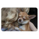 charlie chihuahua genießt eine Kuschel mit seinem Besitzer, einem süßen blonden Mädchen