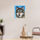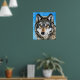 Ein Acrylgemälde eines grauen Wolfs über einem blauen Hintergrund.