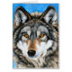 Eine Acrylmalerei eines grauen Wolfs über einem blauen Hintergrund.