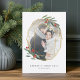 Les élégants cartes de fin de année géométriques présentent votre ensemble de photos préféré dans un cadre inspiré de pierres précieuses en fausse feuille d'or, accentué de feuilles d'aquarelle verte et de baies rouges. Personnalisez avec vos noms et un bref accueil personnalisé de vacances (avec "noël le plus joyeux") et ajoutez deux photos supplémentaires à l'arrière, avec l'année.