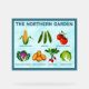 Eine humorvolle Gärtnerei an Orten mit kalten Klimazonen wie Alaska, Minnesota und Kanada. Man kann nicht alles wachsen lassen, aber die illustrierten hier ausprobieren: Yukon-Hauptkorn, Schneeerbsen, Yukon-Haupttomate, Jänner-Königskraut, Yukon-Goldkartoffel, Icicle-Radish und Iceberg-Salat. Jede ist beschriftet und Text wird gelesen, "DER NORDGARTEN" erscheint ebenfalls. Sie können die Randfarbe leicht ändern oder ganz entfernen.