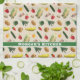 Gemüsemuster Küchentuch mit Platz für den Koch. Obst und Gemüse Muster auf weißen Handtüchern mit zwei Plätzen für maßgeschneiderten Text. Jedes Ende des Handtuches hat einen Bar mit Großbuchstaben, mit Beispielworten, "Essen gut" und "Küche des Namens". Zu den Gemüse zählen viele Dinge, die in einem Garten im Garten angebaut werden, wie Paprikaschoten, Zwiebeln, Mais, Gurken, Squash und Kartoffeln.