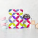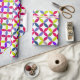 Alltägliche, kreisförmige gemusterte Verpackung für Geburtstage oder andere Anlässe. Papier in kühlem Rot, Kalkgrün, lila, blau, grau und weiß. Entworfen von Sarah Trett.