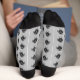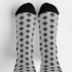 Dieses phantastische Paar gemusterter Crew-Socken zeichnet sich durch eine gruselige Eule aus, die riesige, wölkende Augen und verdrehte Krallen aufweist. Sein Körper ist schwarz und seine Flügel, Ohren und Klauen und Schnabel sind grau. Diese gruselige Eule kann sich unter dem Deckmantel der Dunkelheit unsichtbar verstecken und ist der Stoff, aus dem Albträume bestehen.