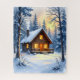 Eine friedliche Blockhütte leuchtet bei Sonnenuntergang warm inmitten eines schneebedeckten Waldes. Große Kiefernbäume umgeben die Hütte, da das goldene Licht der untergehenden Sonne auf den Schnee reflektiert. Ideal für Wintersportler, rustikale Kabinendekoration und gemütliche Ferienvibes.