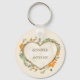 Erstellen Sie mit diesem Schlüsselanhänger ein besonderes kleines Geschenk oder einen besonderen Gefallen, der bereit ist, mit Namen oder anderen benutzerdefinierten Text personalisiert zu werden. Es zeigt eine Aquarellillustrierung eines mit Blume, Herbstblättern und Grünpflanzen geschmückten Holzherzes, das mit braunen Schriftzeichen personalisiert werden kann.