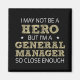 Ich bin vielleicht kein Held, aber ich bin ein Geschäftsführer, der so nah genug humorvolle Wortkunst in Sans-Serif und doodle Cross-Luch-Schriftart in weißem und goldgelbem Schrift zeigt.