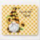 Ein hübscher kleiner Gnome in einem karierten Büffeldruck in Gelb und Schwarz hat einige Sonnenblumen gewonnen. Gelber Gingham Hintergrund. Im Text steht "Genieße die Kleinen Dinge".