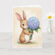 Designed with a gentle digital illustration style, the front shows a light-brown bunny with long ears and a fluffy white tail sitting on soft green grass 🐰. Its big dark eyes catch small highlights, and a tiny rosy nose and slight smile give it a sweet, friendly look, like it’s waiting to share a quiet moment. The bunny holds a rounded bouquet close to its chest, as if offering it with shy affection, the stems tucked neatly between its paws. The flowers form a full cluster that shifts from airy sky blue to pale lavender, with layered petals that look soft and full. Behind the scene is a creamy, watercolor-like background with faint texture and diffused light that keeps everything calm and tender. A short Easter greeting sits near the top in a simple, medium-size font, colored in soft lavender to match the blooms 🌷. Green leaves and sturdy stems fan outward beneath the bouquet, adding natural detail against the light backdrop.