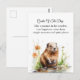 A soft watercolor illustration of a small marmot standing by the water’s edge, surrounded by wildflowers and fresh green grass. With warm brown fur and curious eyes, the scene captures a peaceful moment in nature, evoking calm, innocence, and the quiet beauty of the meadow.