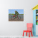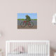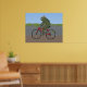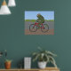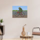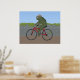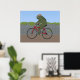 A dark green frog wearing a tan plaid ivy cap (or driving cap) and a satisfied smile pedals along on a red bicycle on a dirt road by a moss-covered gray stone wall in the mixed media image on this poster print. With deep blue skies above, it looks like he has a beautiful day for cycling! From my original digitally created image.