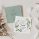 Diese geometrische goldgrüne Vorder- und Rückseite der Hochzeitsreise ist perfekt für eine moderne Hochzeit. Das Design besticht durch handbemalte grüne Blätter, die einen goldenen geometrischen Rahmen schmücken. Rett Papier, indem man mehr Details auf der Rückseite der Einladung anstatt auf einer separaten Gehäusekarte angibt.