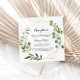 Diese geometrische, goldgelbe, grüne Hochzeitskarte eignet sich perfekt für eine moderne Hochzeit. Das Design besticht durch handbemalte grüne Blätter, die einen goldenen geometrischen Rahmen schmücken.