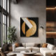 Eine abstrakte Komposition, die einen goldenen Kreis, ein dunkles Dreieck und einen weißen Streifen in elegantem Kontrast vereint. Das Kunstwerk vermittelt ein Gleichgewicht zwischen Kraft und Subtilität, erforscht den Dialog geometrischer Formen, Licht und Schatten und ruft Modernität und zeitlose Eleganz hervor.