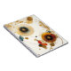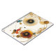 Eine abstrakte Komposition mit miteinander verbundenen Kreisen und strahlenden Mustern in Gold, Blau und Rot, die ein kosmisches oder himmlisches Thema mit einem modernen künstlerischen Flair hervorruft.