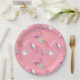 Das Fun Paper Party Teller Muster zeigt den Stil der 1990er Jahre mit abstrakten geometrischen Formen und Schnüren in den heißesten Farben des Jahrzehnts - alles auf einem rosa Hintergrund.