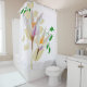 Die Duschvorhänge sind mit zarten, krokus-ähnlichen Blumenelementen gerahmt, die von beigen Venen und grünen Weinreben mit durchsichtigen, weißen Blätter, die Tiefe und Textur vor einem Hintergrund konzentrischer, quadratischer Linien verleihen, einen eleganten Kontrast schaffen.
