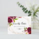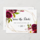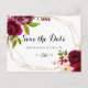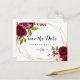 Diese geometrische, rustikale, waagerechte, blumengeschmückte, Save the Date Postkarte ist ideal für eine einfache Hochzeit. Die Einrichtung besteht aus rosa, rot, bordeauxrot und bordfarbenen Blume mit grünem Blattwerk, die einen geometrischen Rahmen verzieren.