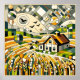 Ein abstraktes Bild einer Scheune inmitten eines Weizenfeldes. Die Hauptfarbe ist gelb.
