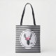 Ein personalisierter, monogramm Totbeutel mit einem schwarzen Hirschkopf aus geometrischer Linie und einer rosa Blumenkrone. Rustikales und trendiges Design. Hintergrund ist ein Muster mit schwarz-weißem Streifen.