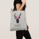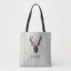 Ein personalisierter Totbeutel mit einem schwarzen Hirschkopf aus geometrischen Linien und einem rosa Blumenkronen. Rustikales und trendiges Design. Der Hintergrund ist ein digitales Bild von etwas Holz.