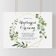 Dieses geometrische goldene tropische Zeremonie-Zeichen ist perfekt für eine einfache Hochzeit oder ein einfaches Brautparty. Das Design besticht durch handbemalte grüne Blätter, die einen goldenen geometrischen Rahmen schmücken.
