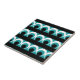 Geometrische Musterdarstellung mit Streifen, Kreisen und runden Formen in den Farben Türkis, Schwarz und Weiß