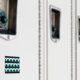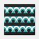 Geometrische Musterdarstellung mit Streifen, Kreisen und runden Formen in den Farben Türkis, Schwarz und Weiß