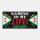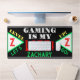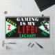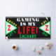 Spaß Video-Gamer Name in grüner Typografie. Geometrisches Muster mit Monogramm, das auf beiden Seiten in hellgrünen, weißen Dreiecken anfänglich rot ist. Gaming ist mein Leben in coolem, weißem und rotem Schriftart geschrieben. Level up lassen Sie uns in gelben und grünen Farben schreiben. Schwarzer Hintergrund mit silbernen Streifen. Spaß für Kinder jeden Alters. Original Design von TamiraZDesign.