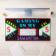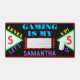 Spaß Kinder Video-Gamer Name in leicht lila Typografie. Geometrisches Muster mit Monogramm, das auf beiden Seiten in hellgrünen und weißen Dreiecken anfänglich rot ist. Gaming ist mein Leben geschrieben in hellblau und rot Schriftart. Level up lassen Sie uns in gelben und lila Farben schreiben. Schwarzer Hintergrund mit rotem Schnitt. Original Design von TamiraZDesign.