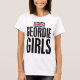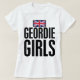 Dieses Shirt zeigt den Gewerkschafts-Jack (Gewerkschaftsflagge) in patriotischem Rotem, Weiß und Blau, ist darunterliegend die Wörter "GEORDIE MÄDCHEN", das in schwarze mutige Beschriftung geschrieben wird.