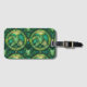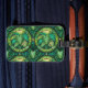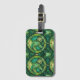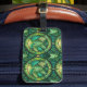 Gepäckanhänger mit tropischem Blattmuster in grünen und gelben Farbtönen mit kreisförmigen Designs. Ein schwarzer Riemen mit goldener Schnalle ist befestigt.